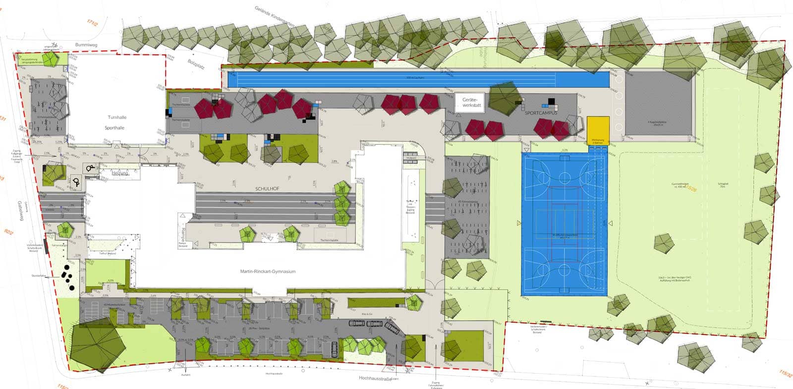 Die Außen­an­la­gen des Martin-Rinckart-Gymnasiums wurden umfas­send neu gestal­tet und um norm­ge­rechte Schul­sport­flä­chen ergänzt. Entlang der Wohn­ge­biets­straße öffnet sich das Schul­areal bewusst zum öffent­li­chen Raum, wofür die Zaun­an­la­gen zurück­ge­setzt und klare Eingangs- und Erschlie­ßungs­be­rei­che geschaf­fen wurden. Schul­hof, Sport­cam­pus und öffent­li­che Vorbe­rei­che sind über ein linier­tes Asphalt­band, die „Noten­spur“, mitein­an­der verbun­den, das als zentra­les gestal­te­ri­sches Element fungiert. Entstan­den sind viel­fäl­tige Sport- und Bewe­gungs­flä­chen wie eine 100-m-Laufbahn, ein Multi­funk­ti­ons­feld, Weitsprung‑, Schlagball- und Kugel­stoß­an­la­gen, ergänzt durch Aufenthalts- und Rück­zugs­zo­nen. Zudem wurde die Anlage so geplant, dass sie im Kata­stro­phen­fall als Stütz­punkt für Hilfs­kräfte nutz­bar ist.