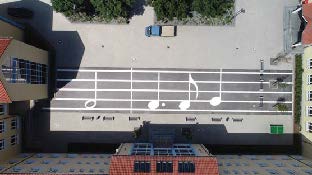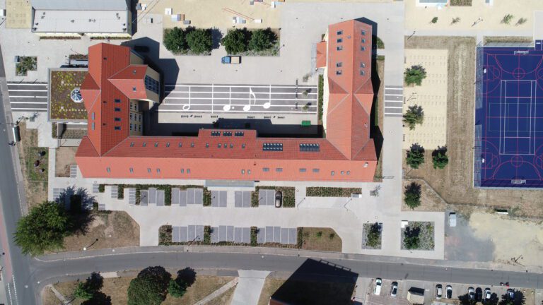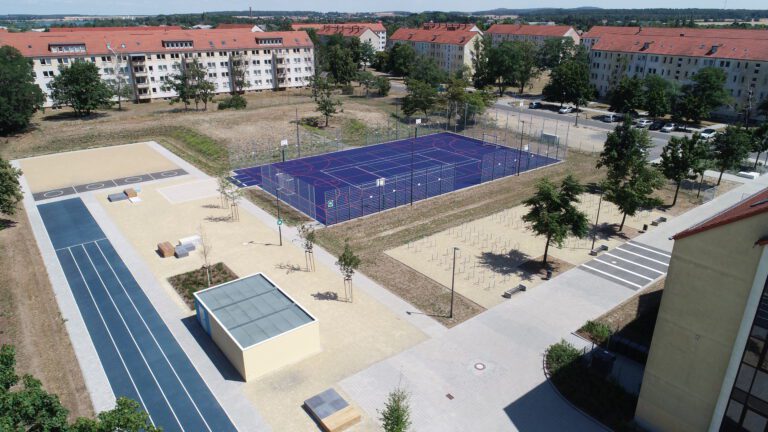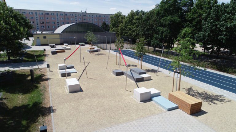 Die Außenanlagen des Martin-Rinckart-Gymnasiums wurden umfassend neu gestaltet und um normgerechte Schulsportflächen ergänzt. Entlang der Wohngebietsstraße öffnet sich das Schulareal bewusst zum öffentlichen Raum, wofür die Zaunanlagen zurückgesetzt und klare Eingangs- und Erschließungsbereiche geschaffen wurden. Schulhof, Sportcampus und öffentliche Vorbereiche sind über ein liniertes Asphaltband, die „Notenspur“, miteinander verbunden, das als zentrales gestalterisches Element fungiert. Entstanden sind vielfältige Sport- und Bewegungsflächen wie eine 100-m-Laufbahn, ein Multifunktionsfeld, Weitsprung‑, Schlagball- und Kugelstoßanlagen, ergänzt durch Aufenthalts- und Rückzugszonen. Zudem wurde die Anlage so geplant, dass sie im Katastrophenfall als Stützpunkt für Hilfskräfte nutzbar ist.