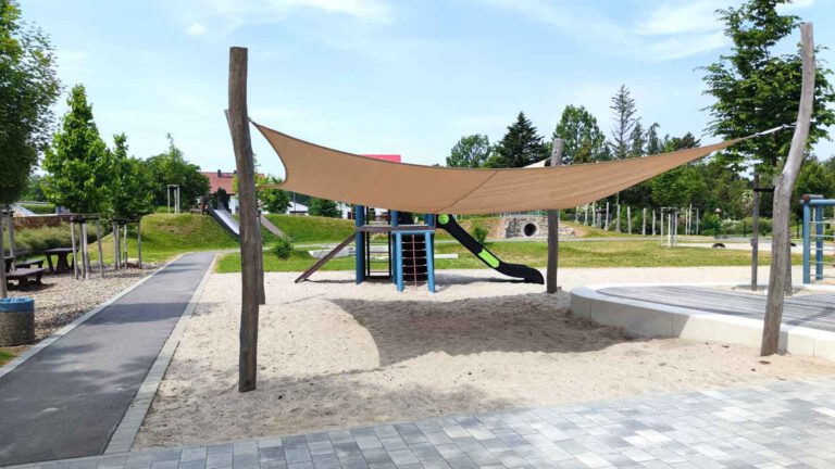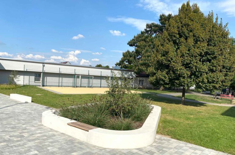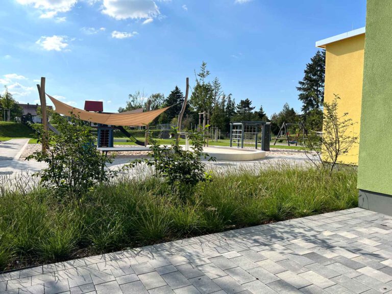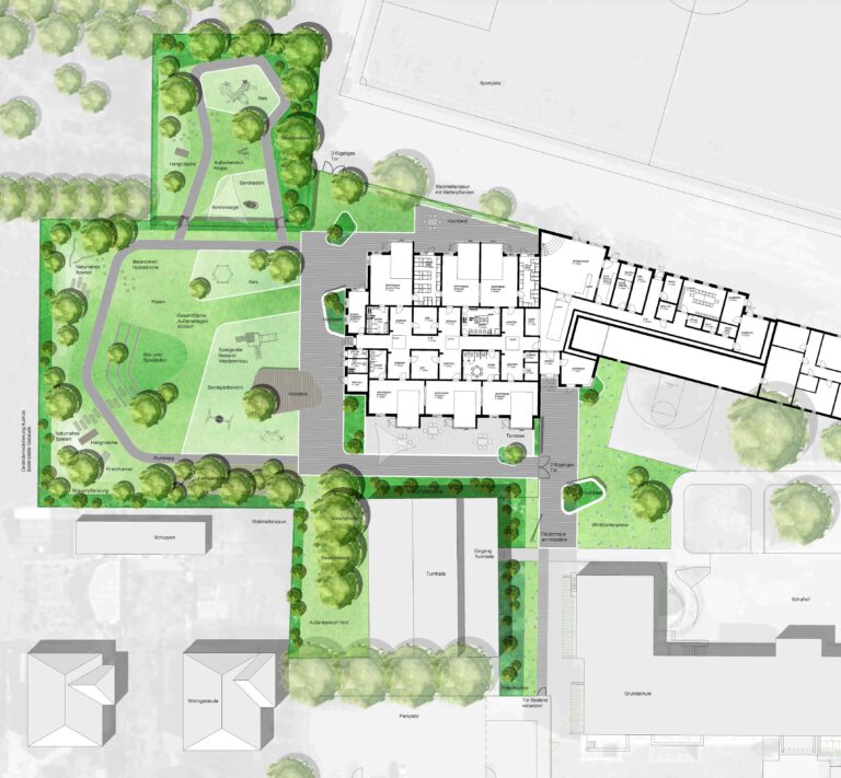 Der Neubau der integrativen Kita wird zum zukunftsweisenden Baustein am Bildungscampus Thallwitz. Dabei nutzt die Kita die vorhandenen Potenziale der Schul- und Sporteinrichtungen. Neben der Förderung der Nachhaltigkeit des gesamten Standorts wie z.B. der Niederschlagswasserversickerung des Neubaus als auch bestehender Dachflächen werden vorhandene Grün- und Spielstrukturen im Hinblick auf eine umweltbewusste Bildung weiterentwickelt. Während die gebäudenahen Bereiche als Terrassen befestigt sind, zeichnen sich die übrigen Freiflächen durch vielfältige Spielangebote und abwechslungsreiche Geländemodellierungen mit integriertem Grünen Klassenzimmer aus. Die Freianlagen enthalten eine vielfältige Anzahl an heimischen Obstbaumsorten. Den Kindern sollen so die verschiedenen Blüte- und Fruchtzeiten im Jahresverlauf nähergebracht werden.