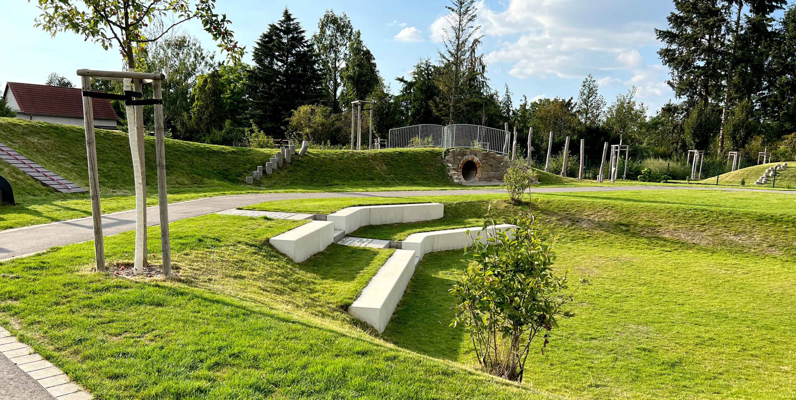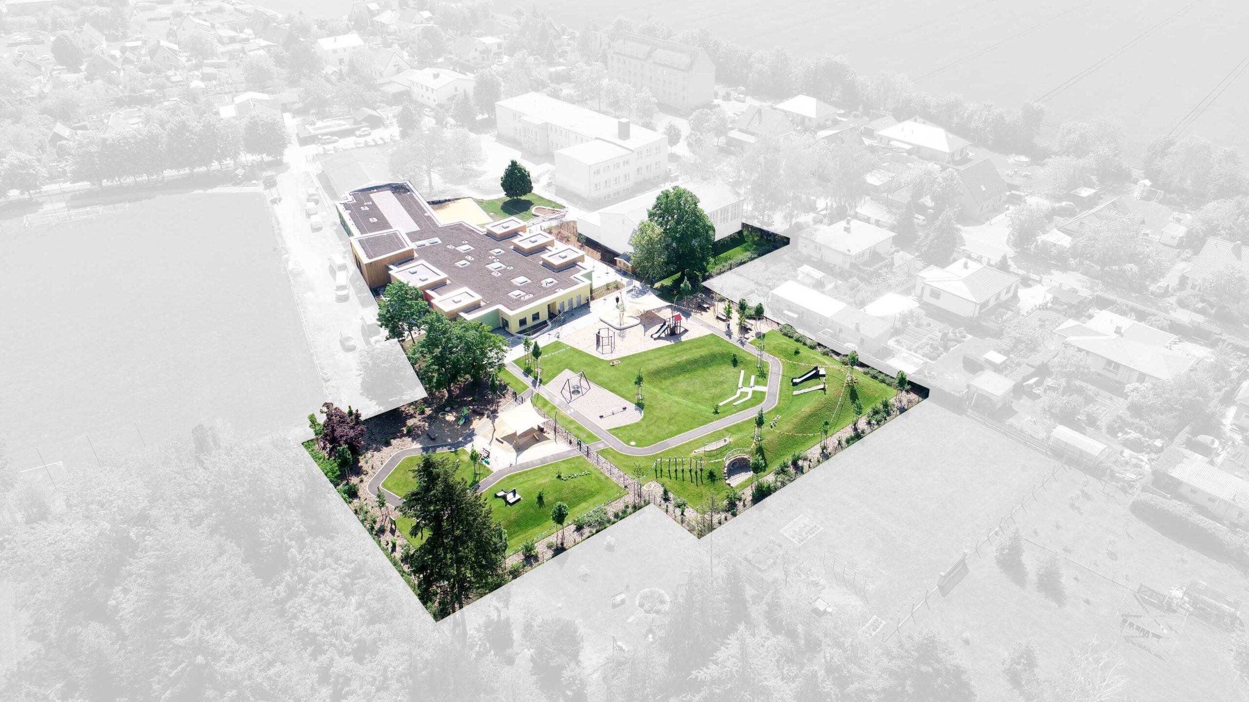 Der Neubau der integrativen Kita wird zum zukunftsweisenden Baustein am Bildungscampus Thallwitz. Dabei nutzt die Kita die vorhandenen Potenziale der Schul- und Sporteinrichtungen. Neben der Förderung der Nachhaltigkeit des gesamten Standorts wie z.B. der Niederschlagswasserversickerung des Neubaus als auch bestehender Dachflächen werden vorhandene Grün- und Spielstrukturen im Hinblick auf eine umweltbewusste Bildung weiterentwickelt. Während die gebäudenahen Bereiche als Terrassen befestigt sind, zeichnen sich die übrigen Freiflächen durch vielfältige Spielangebote und abwechslungsreiche Geländemodellierungen mit integriertem Grünen Klassenzimmer aus. Die Freianlagen enthalten eine vielfältige Anzahl an heimischen Obstbaumsorten. Den Kindern sollen so die verschiedenen Blüte- und Fruchtzeiten im Jahresverlauf nähergebracht werden.