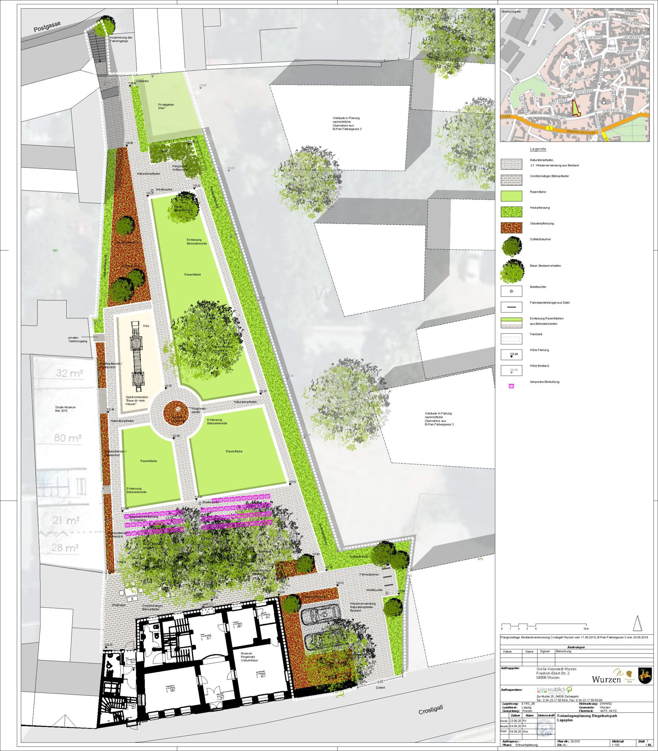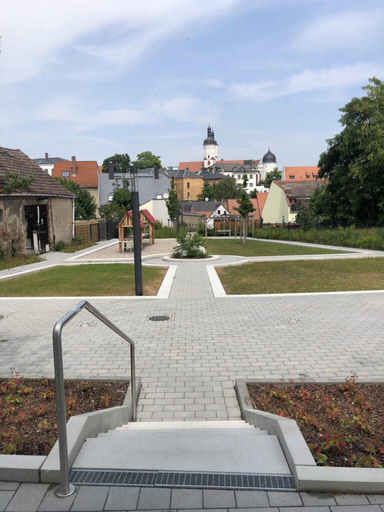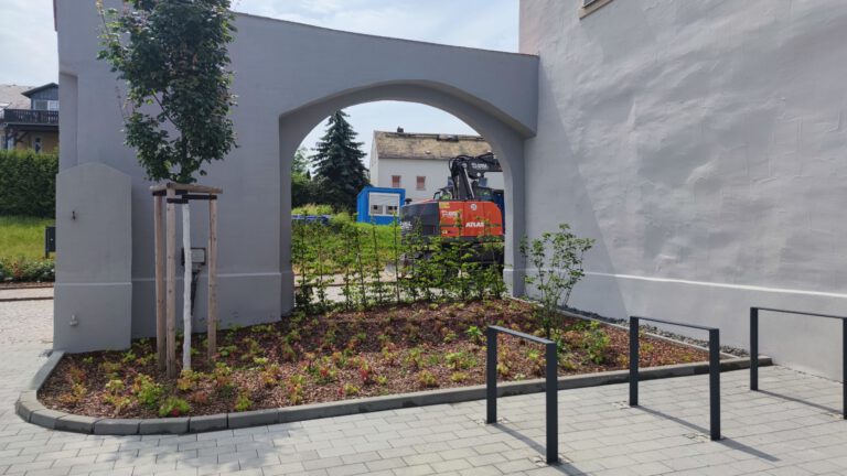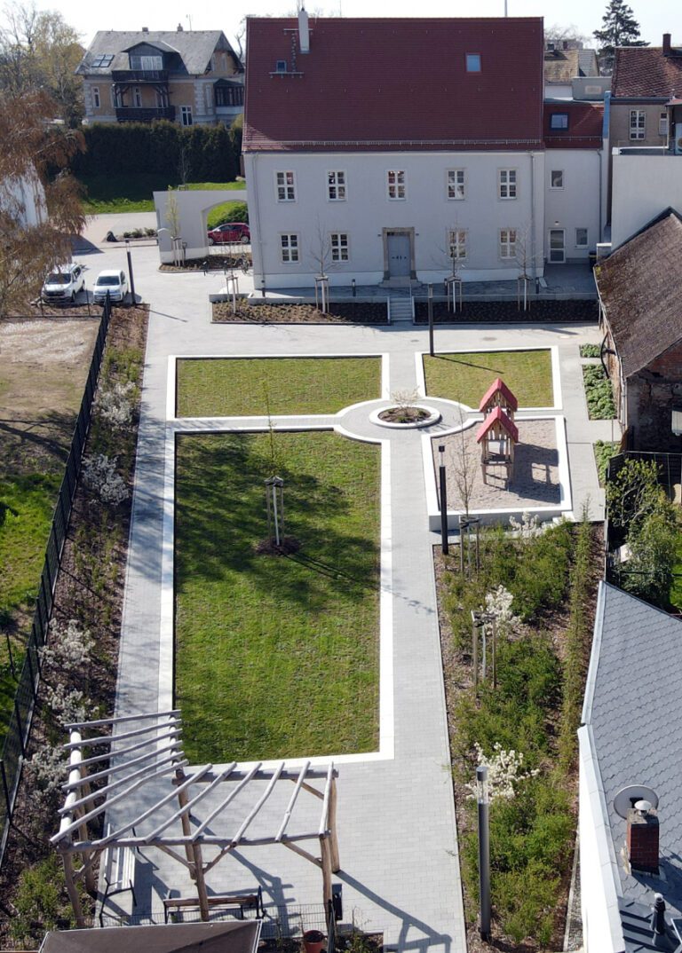Die Planung und Bauüberwachung zur Umsetzung des „Grünen Trittsteins“ im Ringelnatzpark Wurzen erfolgt parallel zur laufenden Sanierung des historischen Ringelnatz-Geburtshauses. Hinter dem denkmalgeschützten Gebäude entsteht eine neugestaltete Freianlage, die sich gestalterisch am barocken Baustil des Hauses orientiert und den Stadtraum zwischen Crostigall und Postgasse aufwertet. Vorgesehen ist ein parkähnliches Gelände mit Terrasse, Aufenthalts- und Sitzbereichen, einer Spielkombination sowie befestigten Flächen, die künftig als Bühne und Kleinkunstareal genutzt werden können. Die Verbindung neu angelegter Grünflächen mit dem Erhalt des bestehenden Baumbestandes soll die naturnahe Atmosphäre des Areals stärken und einen attraktiven, vielseitig nutzbaren Freiraum schaffen.