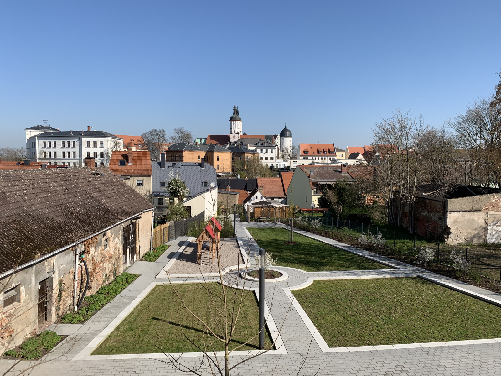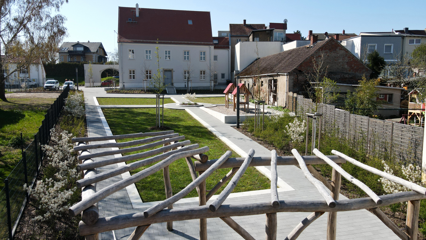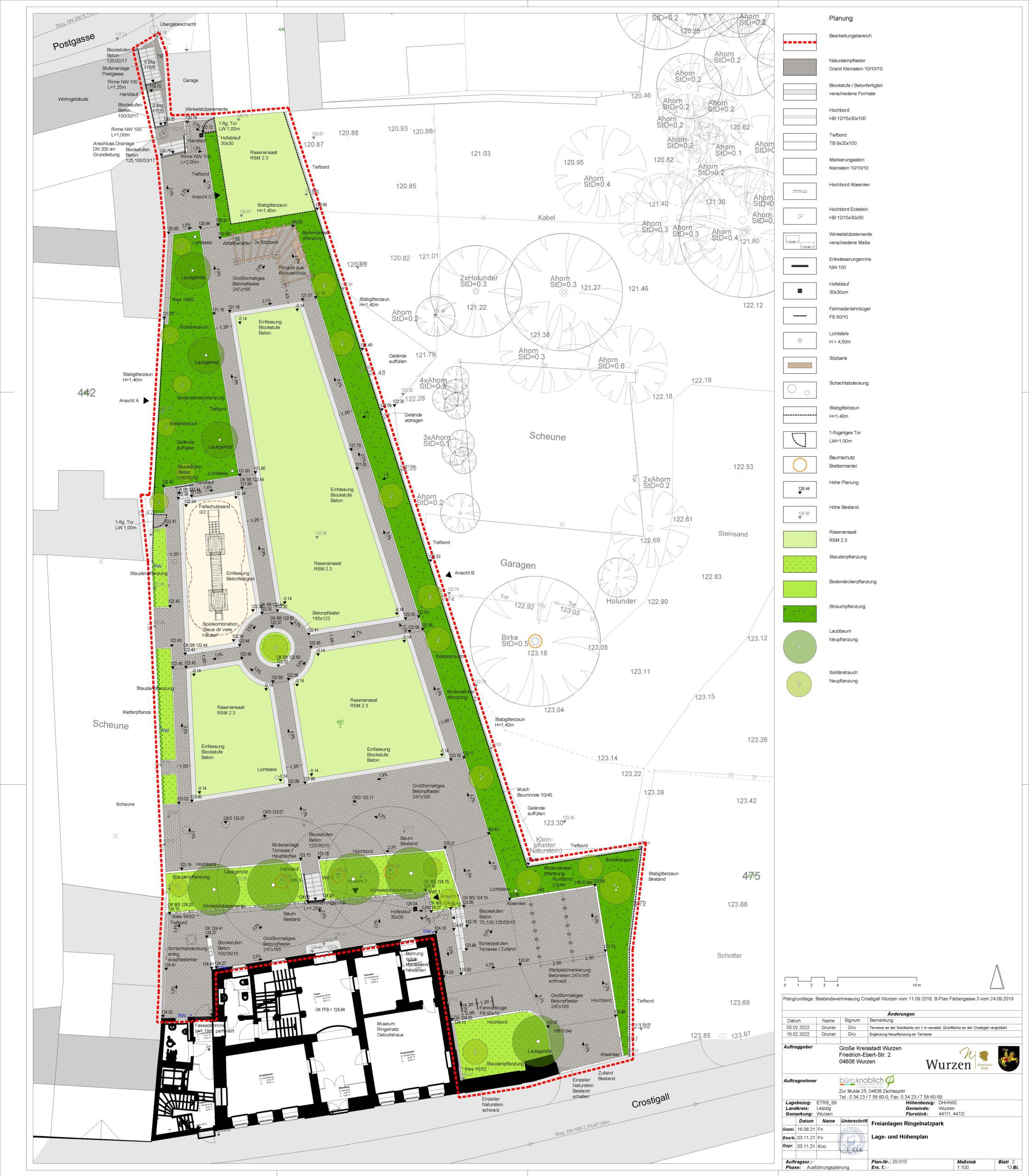 Die Planung und Bauüberwachung zur Umsetzung des „Grünen Trittsteins“ im Ringelnatzpark Wurzen erfolgt parallel zur laufenden Sanierung des historischen Ringelnatz-Geburtshauses. Hinter dem denkmalgeschützten Gebäude entsteht eine neugestaltete Freianlage, die sich gestalterisch am barocken Baustil des Hauses orientiert und den Stadtraum zwischen Crostigall und Postgasse aufwertet. Vorgesehen ist ein parkähnliches Gelände mit Terrasse, Aufenthalts- und Sitzbereichen, einer Spielkombination sowie befestigten Flächen, die künftig als Bühne und Kleinkunstareal genutzt werden können. Die Verbindung neu angelegter Grünflächen mit dem Erhalt des bestehenden Baumbestandes soll die naturnahe Atmosphäre des Areals stärken und einen attraktiven, vielseitig nutzbaren Freiraum schaffen.