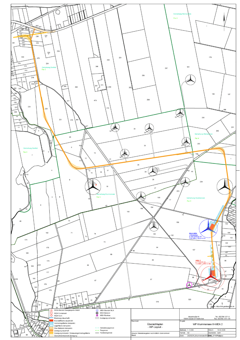 Innerhalb eines bestehenden Windeignungsgebietes ist die Errichtung von vier Windenergieanlagen mit einer Nabenhöhe von 150 m und einem Rotordurchmesser von 141 m geplant. Das Vorhaben dient der nachhaltigen Stromerzeugung aus erneuerbaren Energien und leistet einen wichtigen Beitrag zur regionalen Energiewende. Im Vorfeld der Planung wurde das Projekt umfassend ökologisch untersucht. Hierzu erfolgten detaillierte fachgutachterliche Prüfungen zu Landschaftsbild, Artenschutz sowie zu vorkommenden Vogel- und Fledermausarten. Auch eine gezielte Erfassung des Rotmilans wurde durchgeführt. Die Ergebnisse wurden in entsprechenden Fachbeiträgen und Gutachten dokumentiert und in die Planung integriert. Zur Sicherstellung der artenschutzrechtlichen Anforderungen wurde zudem eine vorgezogene Ausgleichsmaßnahme (CEF-Maßnahme) zum Schutz des Kranichs umgesetzt. Ziel dieser Maßnahme war die Entwicklung eines geeigneten Bruthabitats durch habitatverbessernde Maßnahmen und Wiedervernässung, um die ökologische Funktion der Fortpflanzungsstätte dauerhaft zu gewährleisten. Die Wirksamkeit wird im Rahmen eines fünfjährigen Erfolgsmonitorings überprüft und fachlich begleitet.